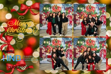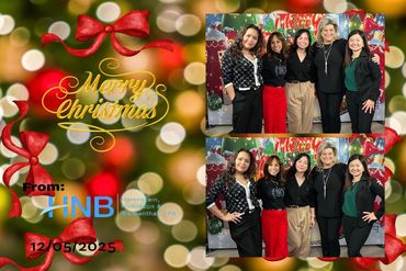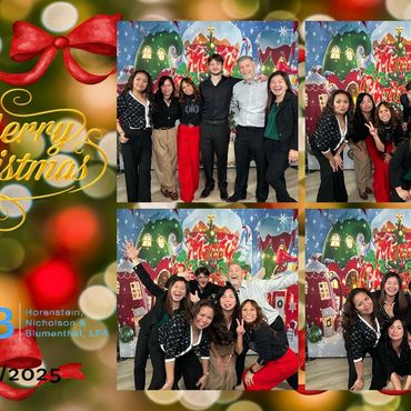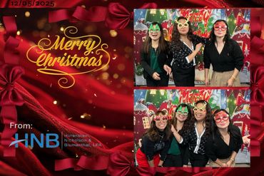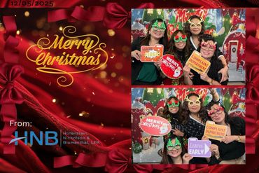 A festive photo booth experience featuring a sleek booth setup with soft studio lighting, a printed Christmas cloth backdrop, and a classic red and white balloon garland accented with foil star balloons—perfect for corporate holiday parties and seasonal celebrations.